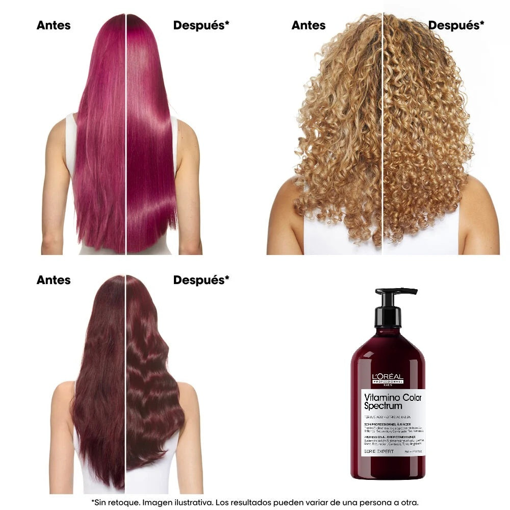 - Lava el cabello con el champú de la misma gama (preferentemente Vitamino Color Spectrum de L’Oréal Professionnel).