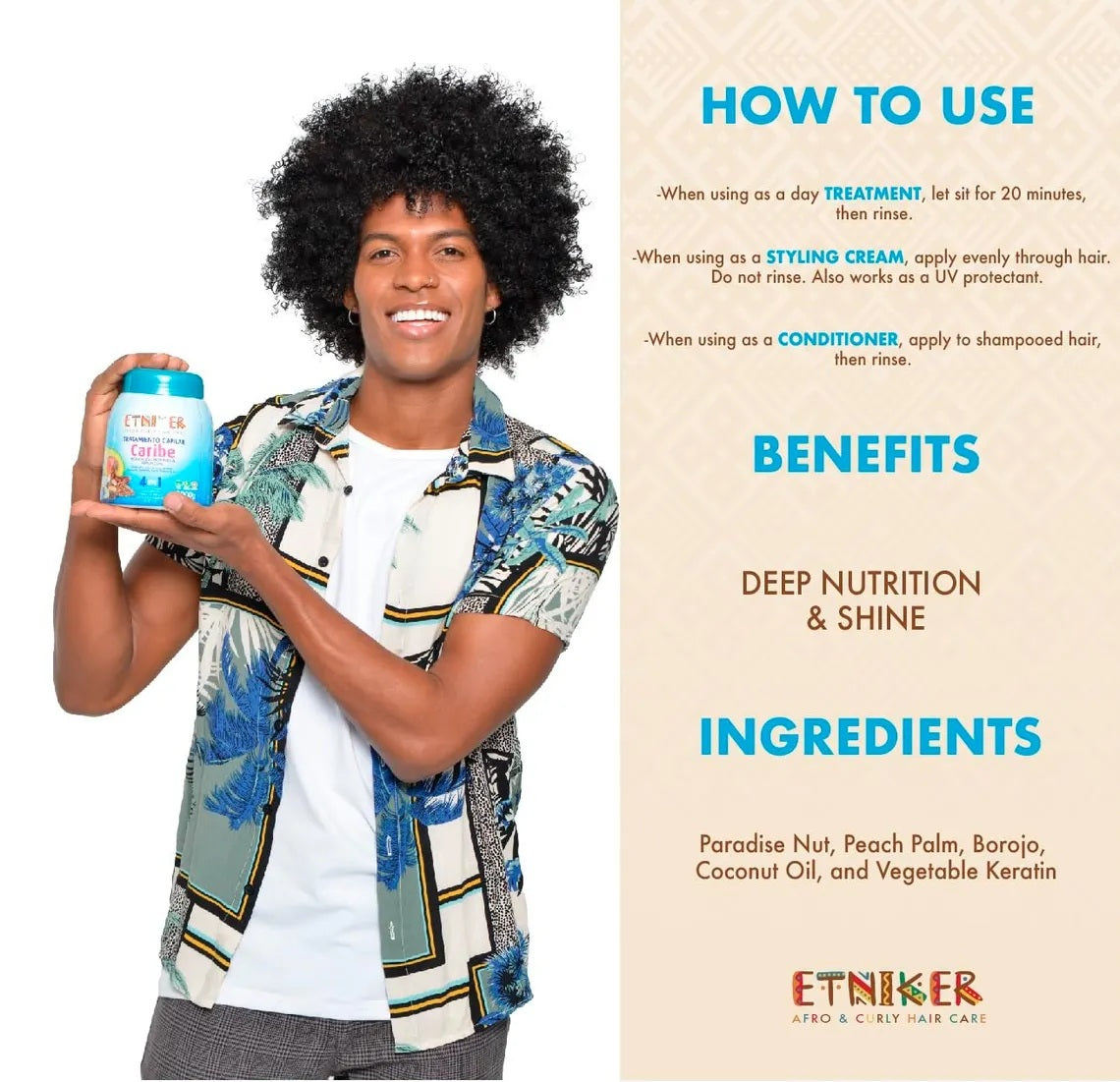 El Tratamiento Etniker Hidratación Caribe es una fórmula profesional diseñada para recuperar el cabello seco, debilitado o expuesto a daños por químicos, calor o factores ambientales. Su mezcla activa de nutrientes, vitaminas y extractos hidratantes inspirados en la riqueza del Caribe devuelve la suavidad, elasticidad y brillo natural desde la primera aplicación.